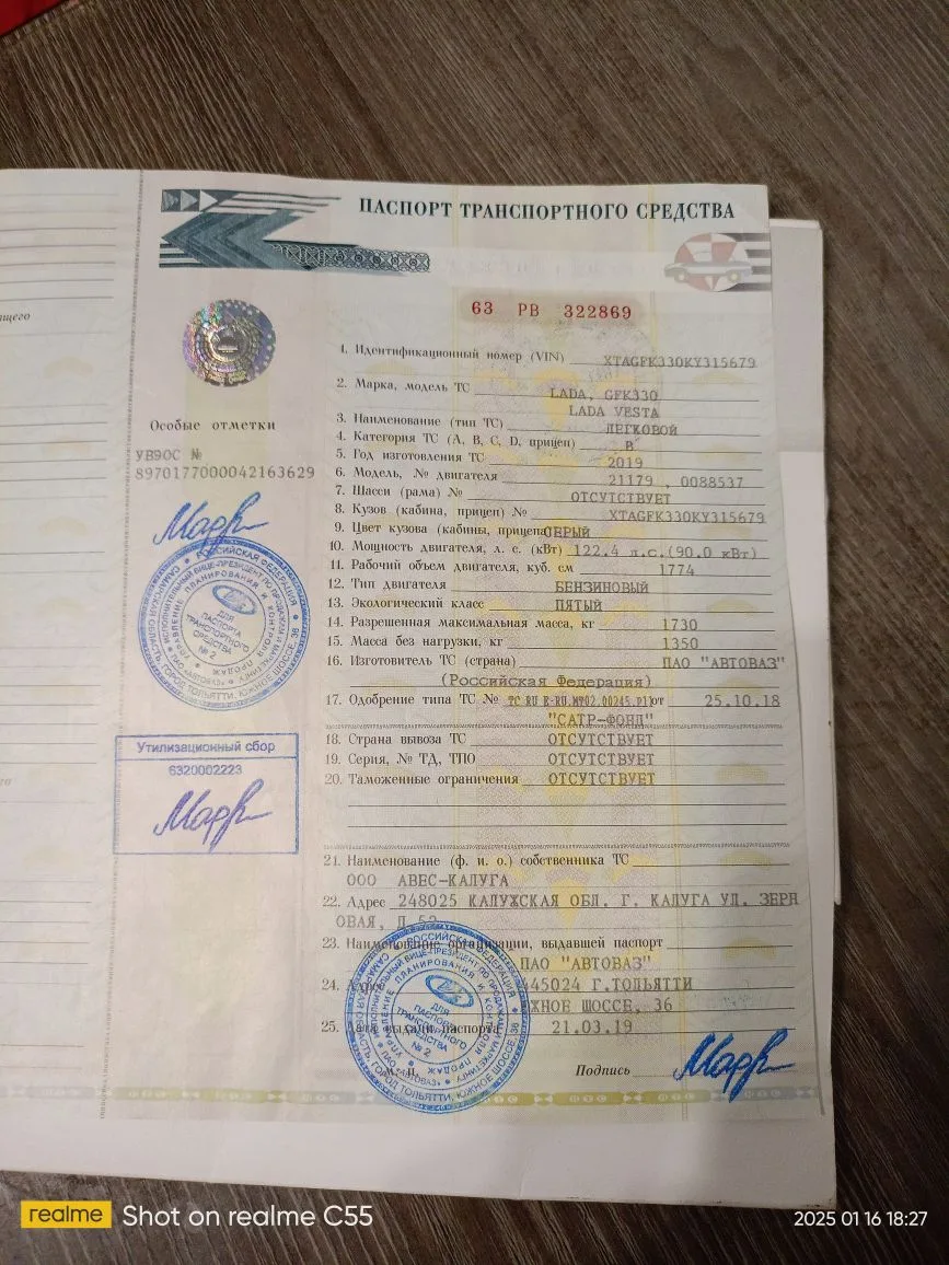 Автомобиль марки LADA модель Vesta, 2019 г.в,. VIN номер XTAGFK330KY315679.