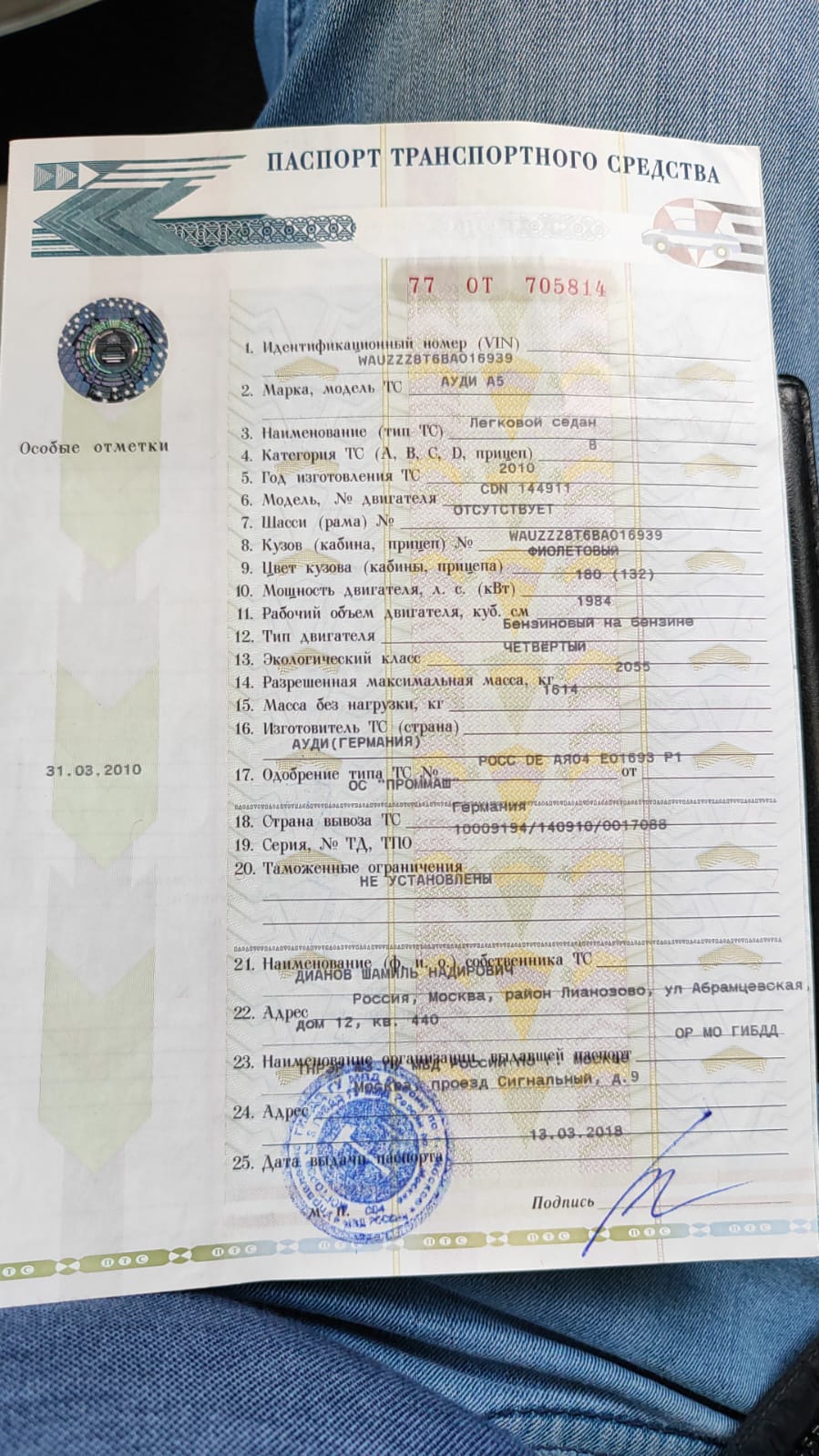 Легковой автомобиль марки: AUDI, модель: A5, год выпуска: 2010г., идентификационный номер (VIN): WAUZZZ8T6BA016939 В залоге у ПАО "Совкомбанк"